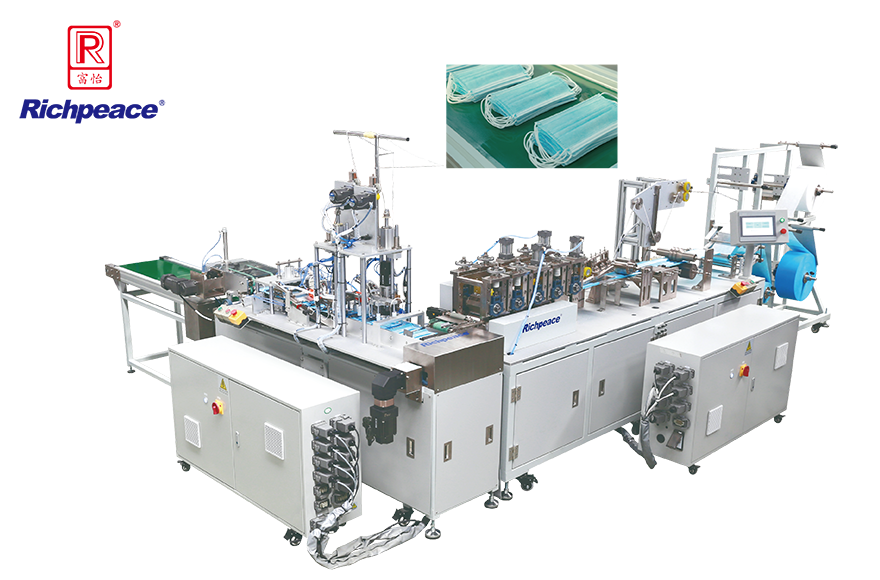 1.生產線采用“ 一拖一 ”的結構,自動送料、剪切鼻夾并完成口罩打片后, 自動傳送到耳帶工位焊接耳帶,并自動碼垛。