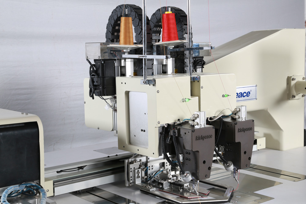 增加兩套獨立機頭裝置,實現了雙色縫紉的全自動雙色自動折邊