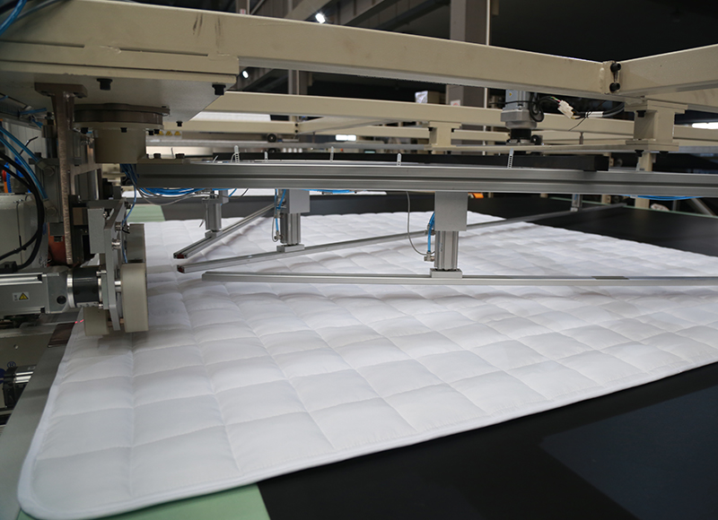 該產(chǎn)線由高速多針紡縫機(jī)、鎖四邊機(jī)、對(duì)正平臺(tái)和全自動(dòng)包邊機(jī)組成,主要生產(chǎn)以多針絎縫線跡和包邊工藝為特征的家紡產(chǎn)品,比如被芯、床蓋等;