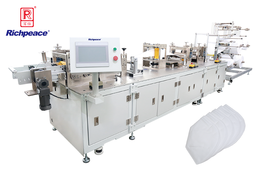 1.1-6 層面料自動(dòng)對(duì)齊入料、鼻梁條剪切推送(選配)、花輥壓花、自動(dòng)噴?。ㄟx配)、對(duì)折入料、封邊、套切到引料導(dǎo)出全流程自動(dòng)化打片作業(yè)。
